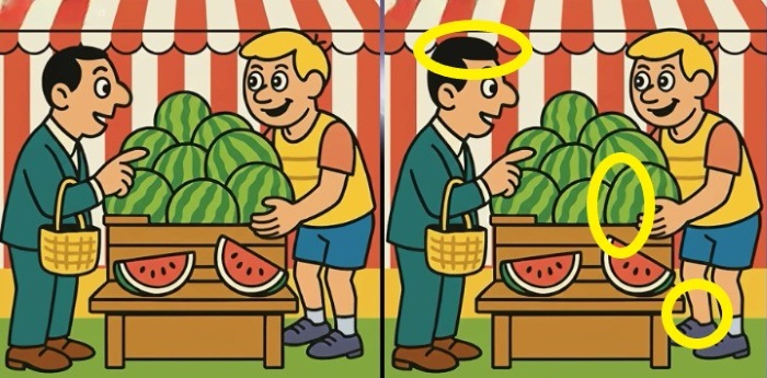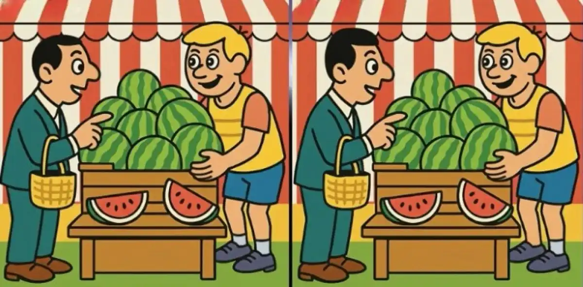 Razlike su sljedeće. Prvo, pogledajte donji desni kut slike, točnije lubenicu na kojoj stoje one manje. Na jednoj slici ispod nje ima jedan list, a na drugoj dva lista. Druga razlika je u prodavačevoj majici – na jednoj slici uz rub dekoltea postoji dodatna kratka crta (šav ili nabor). Treća razlika je na samom stolu: broj lubenica u pozadini se razlikuje; na jednoj slici ih je jedna manje vidljiva.