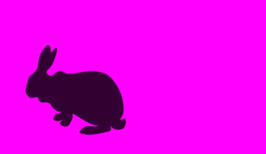 A sada, rješenje. Životinja skrivena u ljubičastom pravokutniku je zec. Kada odmaknete pogled ili promijenite perspektivu, možete vidjeti profil zečje glave okrenut udesno. Duga uha su prikazana kao dva izdužena obrisa, a manji izbočeni dio ispred predstavlja njegov njušku. Cijela životinja formirana je od nijansi i sjene unutar iste boje.