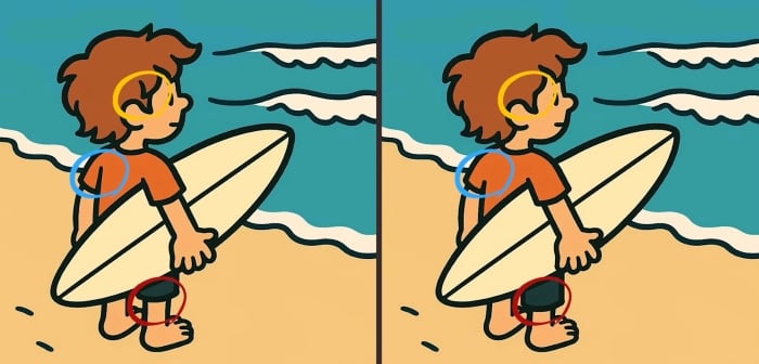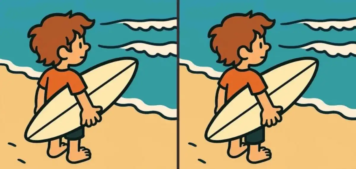 Ova vizualna zagonetka testira vašu pažnju na detalje i brzinu percepcije. Pred vama su dvije naizgled identične slike surfera, ali tri suptilna elementa su promijenjena. Ključ je u sustavnom pregledu i usporedbi svakog segmenta slike, od glave do daske.