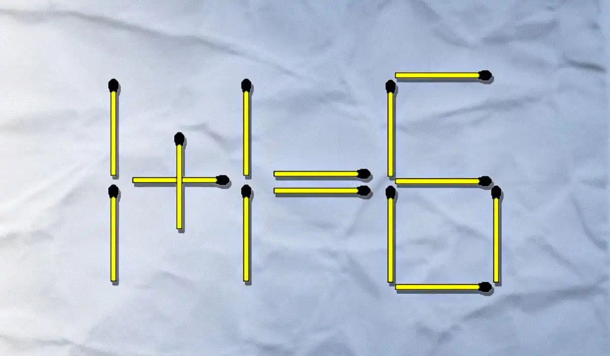 Pred vama je jednadžba: 1 + 1 = 6, sastavljena od šibica. Očito je da nešto nije u redu. Vaš zadatak je jednostavan: presložiti jednu šibicu i ukloniti (ili “baciti”) drugu kako biste dobili matematički točnu jednakost. Možete mijenjati brojeve ili aritmetičke znakove. Spreman? Vrijeme počinje odmah!