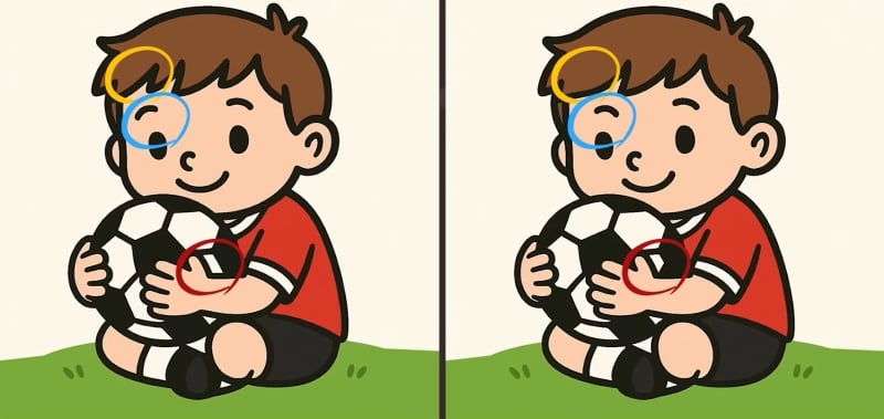 Prva razlika je u oblačiću na nebu. Na jednoj slici oblačić ima malo izduženiji oblik ili je blago pomaknut u odnosu na drugi. Druga razlika se nalazi na dječakovoj majici – uzorak ili nijansa boje na jednoj strani je promijenjena. Treća, i možda najsuptilnija razlika, je u travi ispred dječaka. Jedan komadić trave ili sjena ima drugačiji oblik ili je izostavljen.