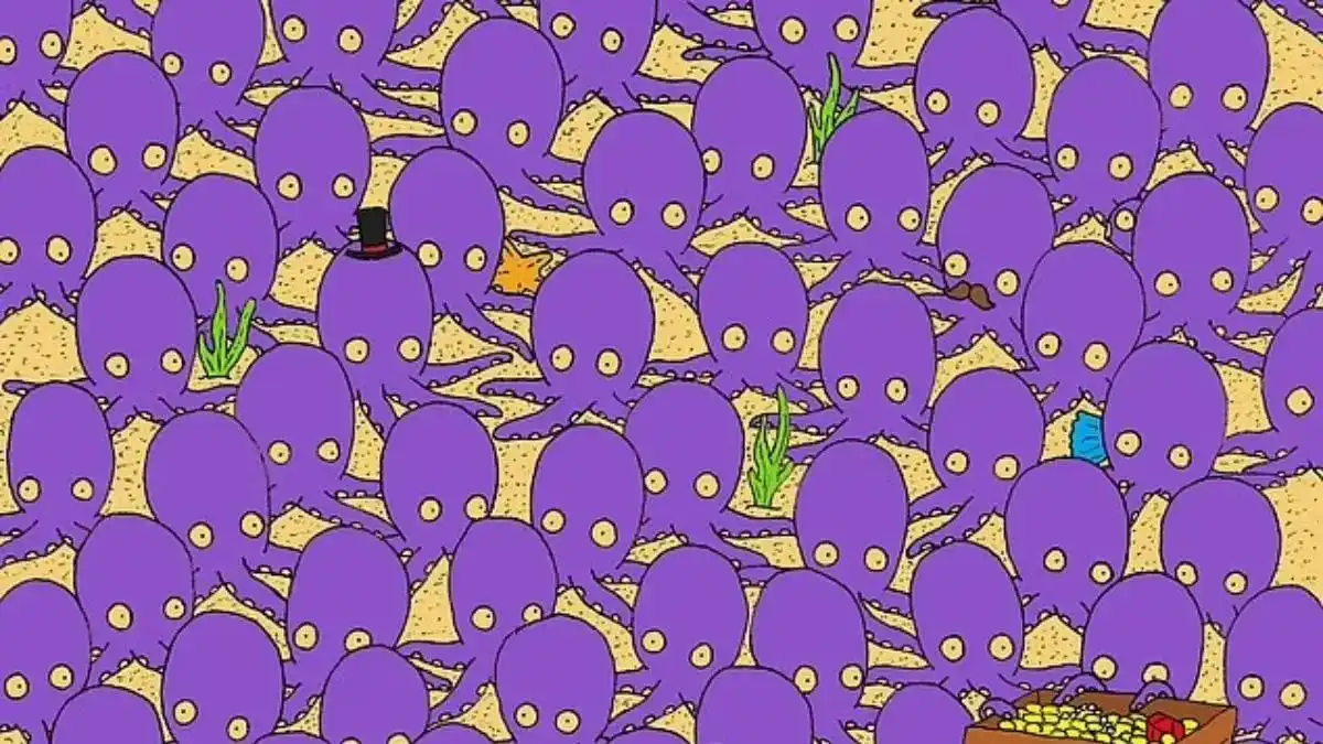 Ova zagonetka testira vašu pažnju i sposobnost razlikovanja detalja u vizualnom neredu. Među mnoštvom hobotnica skriva se jedna riba, a ključ je u tome da prepoznate različiti oblik tijela i strukturu. Ako ste uočili nešto što nema ticala, već peraje, na pravom ste putu.