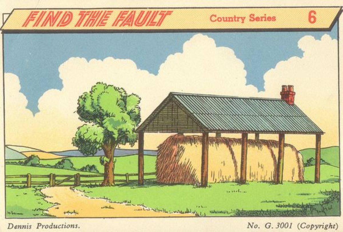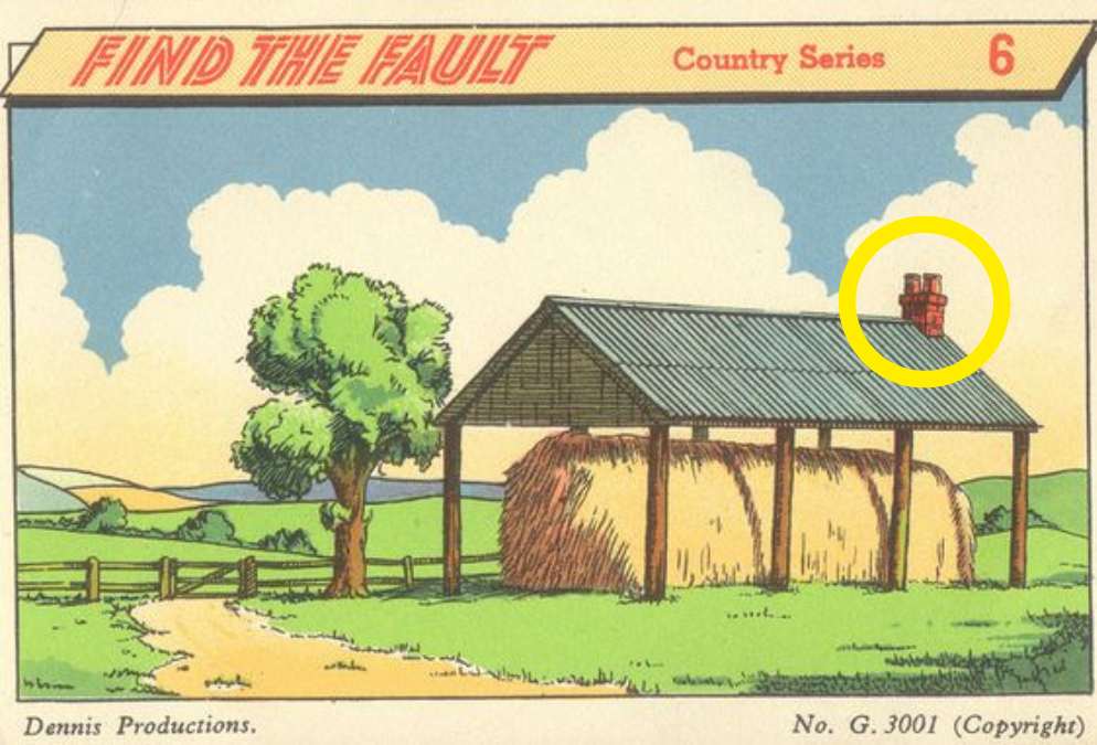 Vrijeme je za rješenje. Greška na slici je dimnjak. Na objektu koji služi za skladištenje sijena (obično otvorena ili dobro prozračena štala) postoji dimnjak. Dimnjaci su karakteristični za objekte s ogrjevnim ili kuhanskim uređajima, poput kuća, kako bi odvodili dim. Na skladištu sijena dimnjak je potpuno nefunkcionalan i besmislen detalj – klasična greška u logici crteža.