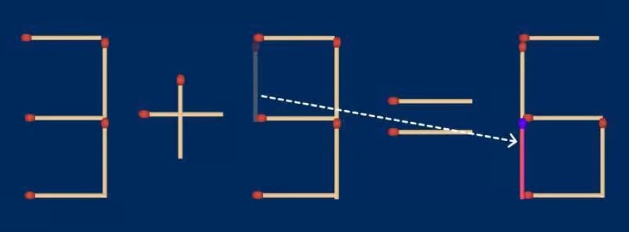 Ako pažljivo pogledate broj 9, uklanjanjem jedne šibice možete ga pretvoriti u broj 5. Koja šibica točno? Donja lijeva okomita šibica broja 9. Uklonite je, i 9 postaje 5. Ali sada imate “višak” šibice. Sjećate se, možete pomaknuti samo jednu, ne ukloniti.