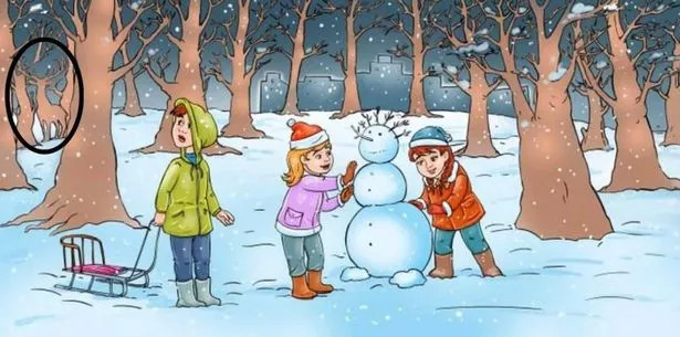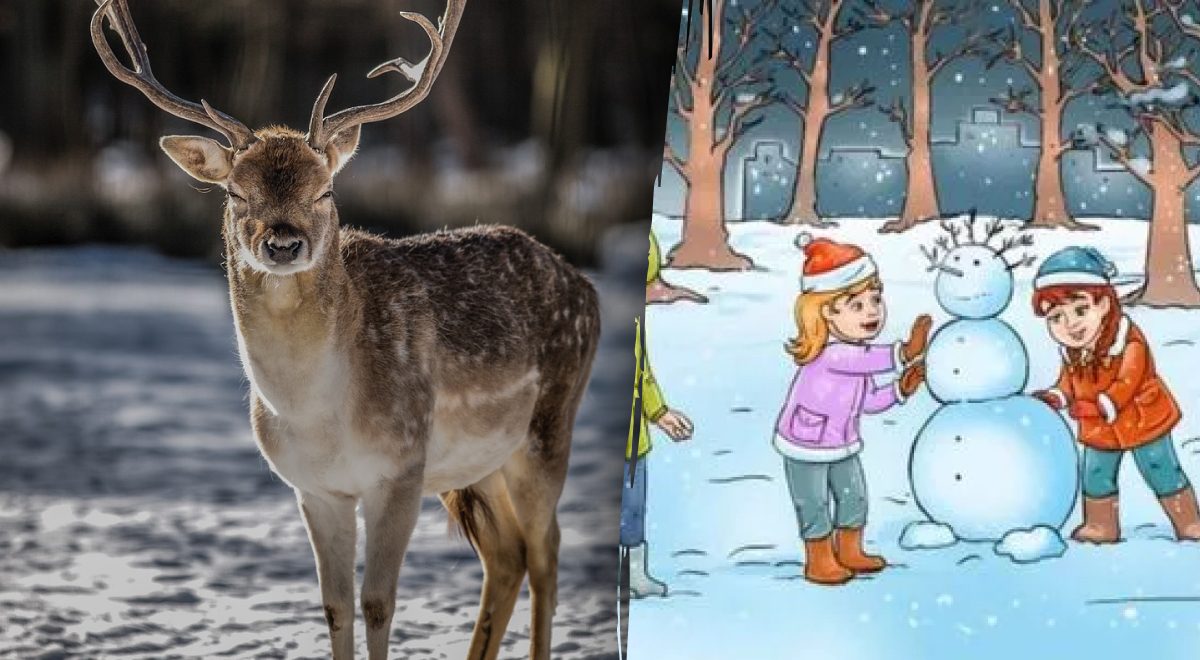 Zamislite da ste u šumi, uživate u zimskoj idili i iznenada čujete šuštanje. Vaš zadatak je otkriti izvor tog šuštanja – jelena koji promatra scenu. Na slici je prikazana radosna scena: dvoje djece pravi snjegovića, treće dijete drži sanjke, a sve je okruženo zimskom šumom. Međutim, negdje u toj šumi, gotovo potpuno stopljen s okolinom, čuči jelen. Imate samo 8 sekundi da ga pronađete. Spreman?