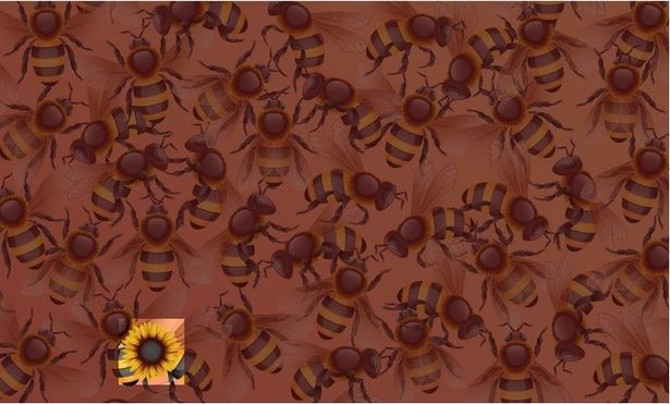 Ako ste se izgubili u roju, evo rješenja. Suncokret se ne nalazi u sredini niti na nekom očitom mjestu. Smjestio se u donjem lijevom kutu slike. Dok se pčele sastoje od glatkih, čvrstih crno-žutih pruga, suncokret ima onu prepoznatljivu grubu teksturu središta okruženog žutim laticama. Kada promijenite fokus s pojedinačnih pčela na cjelokupni uzorak, ta razlika u površini postaje primjetnija.