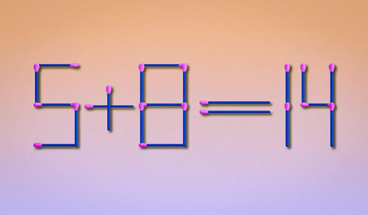 Početna jednadžba je: 5 + 8 = 14. Pogledajte broj 14. Sastavljen je od znamenki ‘1’ i ‘4’. Šibicu koja čini vodoravni dio broja ‘4’ (gornju horizontalnu crtu) možete ukloniti. Time broj ‘4’ postaje ‘1’. Međutim, tu šibicu ne možete samo odbaciti – morate je negdje postaviti. Gdje? Vratimo se na lijevu stranu. Broj 5 možete pretvoriti u broj 9 tako da tu uklonjenu vodoravnu šibicu postavite na vrh broja 5. Sada imate: 9 + 8 = 11? Ne, to ne funkcionira jer je 9+8=17.