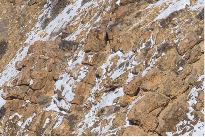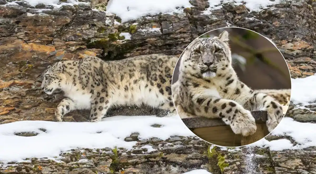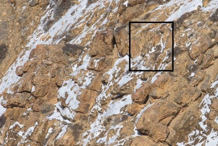 Rješenje je jednostavno kada ga znate. Snježni leopard se nalazi gotovo u sredini donjeg dijela slike. Njegova glava s ušima je vidljiva iznad i lijevo od tamnije stijene u sredini. Tijelo mu se proteže prema desno, a krzno s karakterističnim rozetama stapa se s pjegavim snijegom i kamenjem. Ono što izgleda kao dio stijene zapravo je njegovo tijelo. Kada ga jednom uočite, ne možete ga “ne vidjeti”.