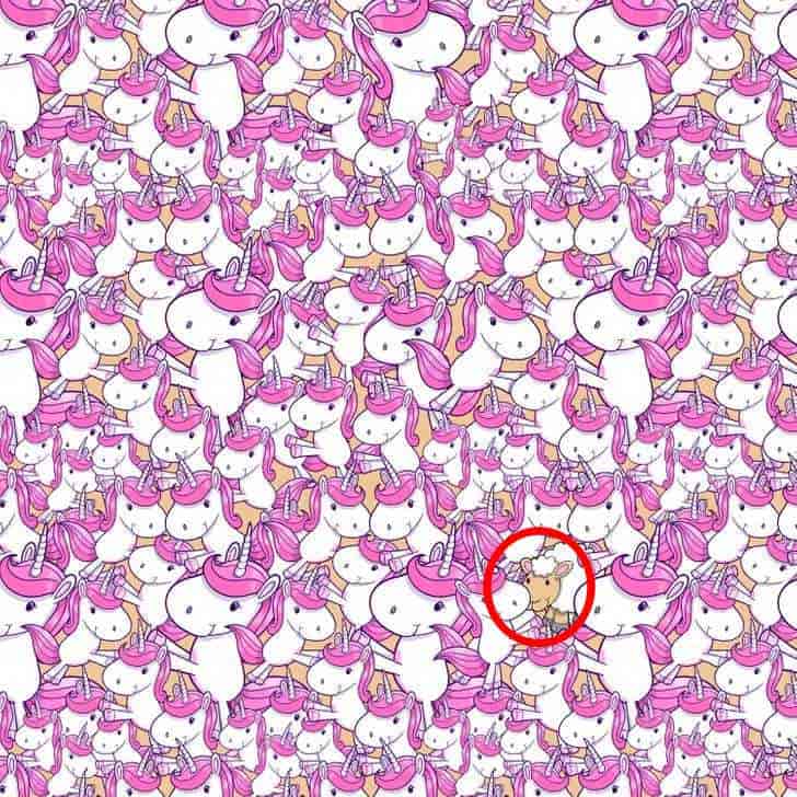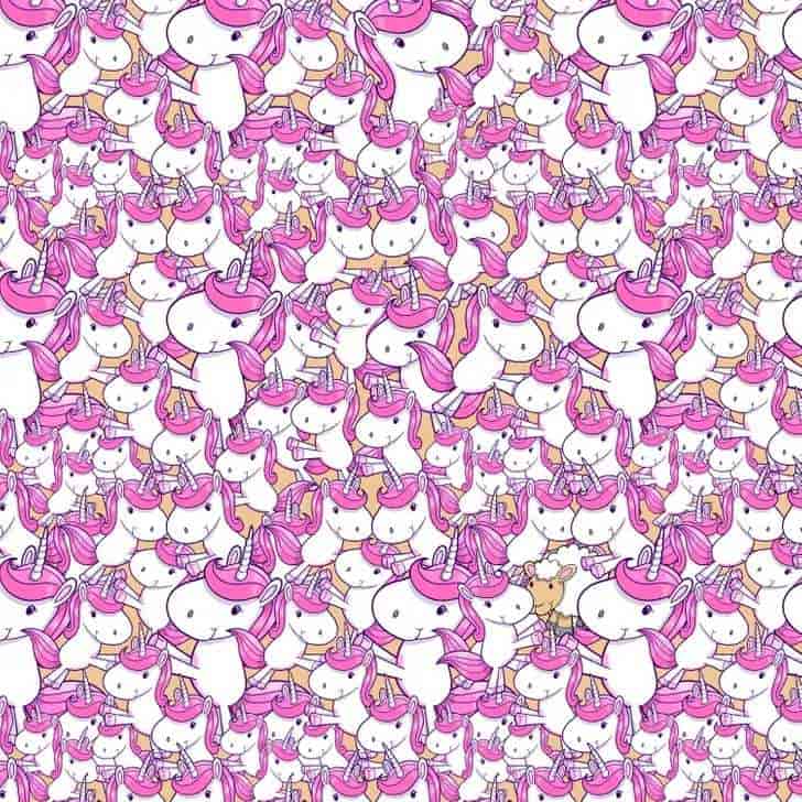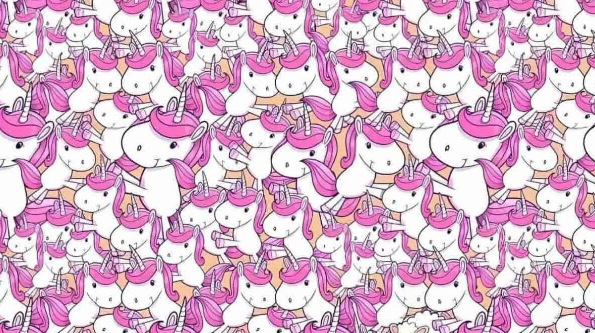 Ova optička zagonetka testira vašu pažnju i sposobnost brzog uočavanja anomalije u ponavljajućem uzorku. Među mnoštvom šareno obojenih jednoroga skriva se jedna obična ovca. Ključ je u tome da ne dopustite da vas obmane sličnosti – potražite ono što izlazi iz ustaljenog patterna.